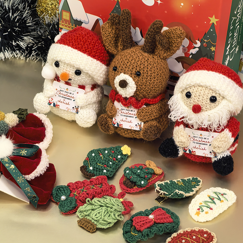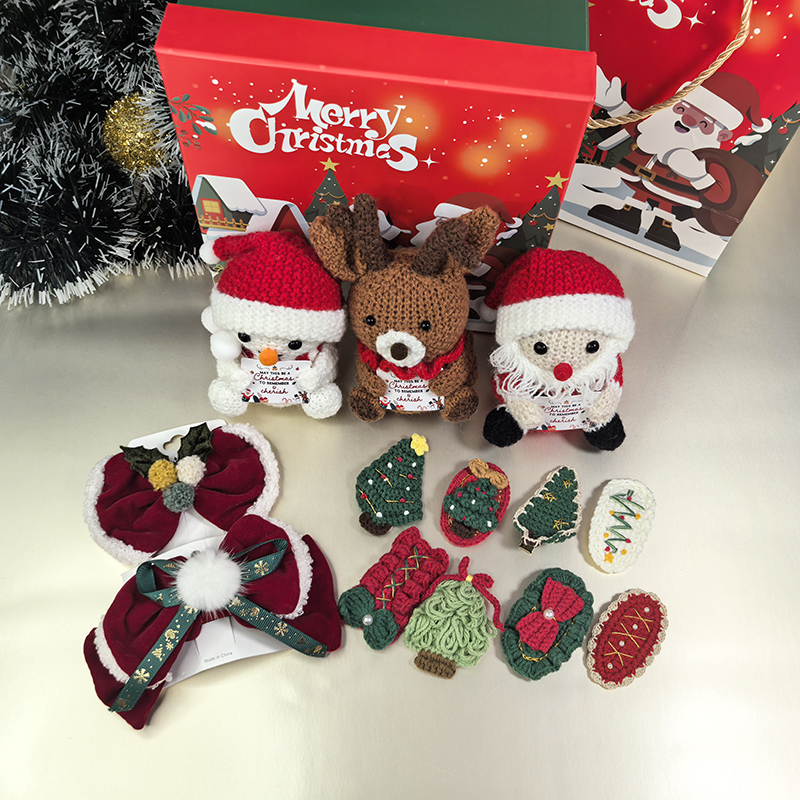 Christmas gift box set for New Year's Christmas girls, beautiful headwear, hair clips, yarn hooks, woven dolls, small ornaments, Santa Claus, snowmen, small brown bears, handmade decorations, collectibles, suitable for giving to friends, relatives, children, Christmas gift bags, New Year gifts